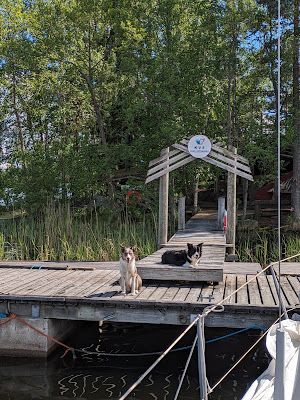 Seuraavaksi yöksi parkkeerasimme Vuoretsalon satamaan virkistysalueen puolelle. Ilta oli tyyni, koirat uivat rannassa ja saunoimme virkistysalueen saunassa. Yöllä länsituuli yltyi ja heitteli venettä, saimme katua jääntiä k.o. puolelle. Aiemmin olemme olleen Jämsän veneseuran puolella suojaisessa lahdessa, mihin suuntaamme myös jatkossa.
